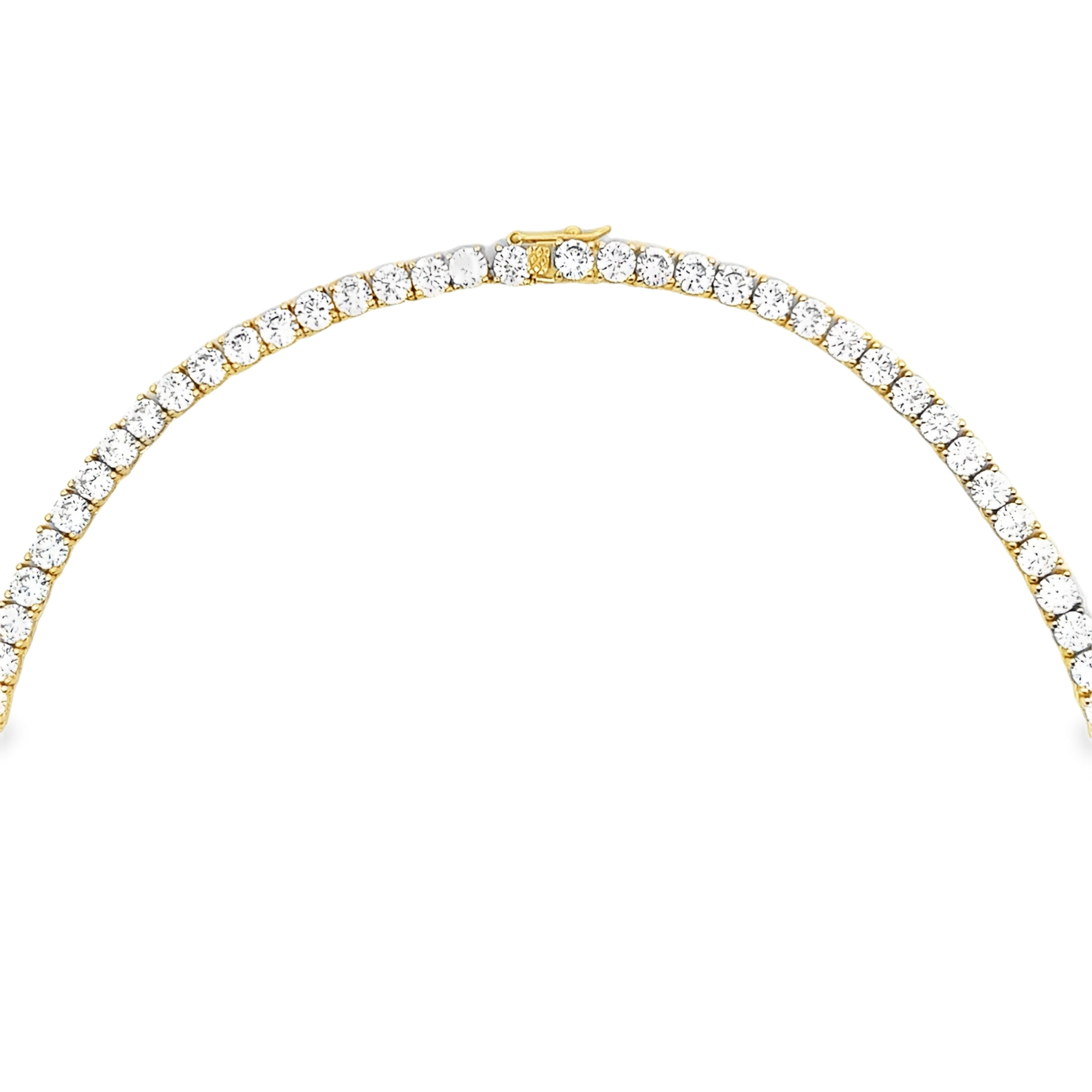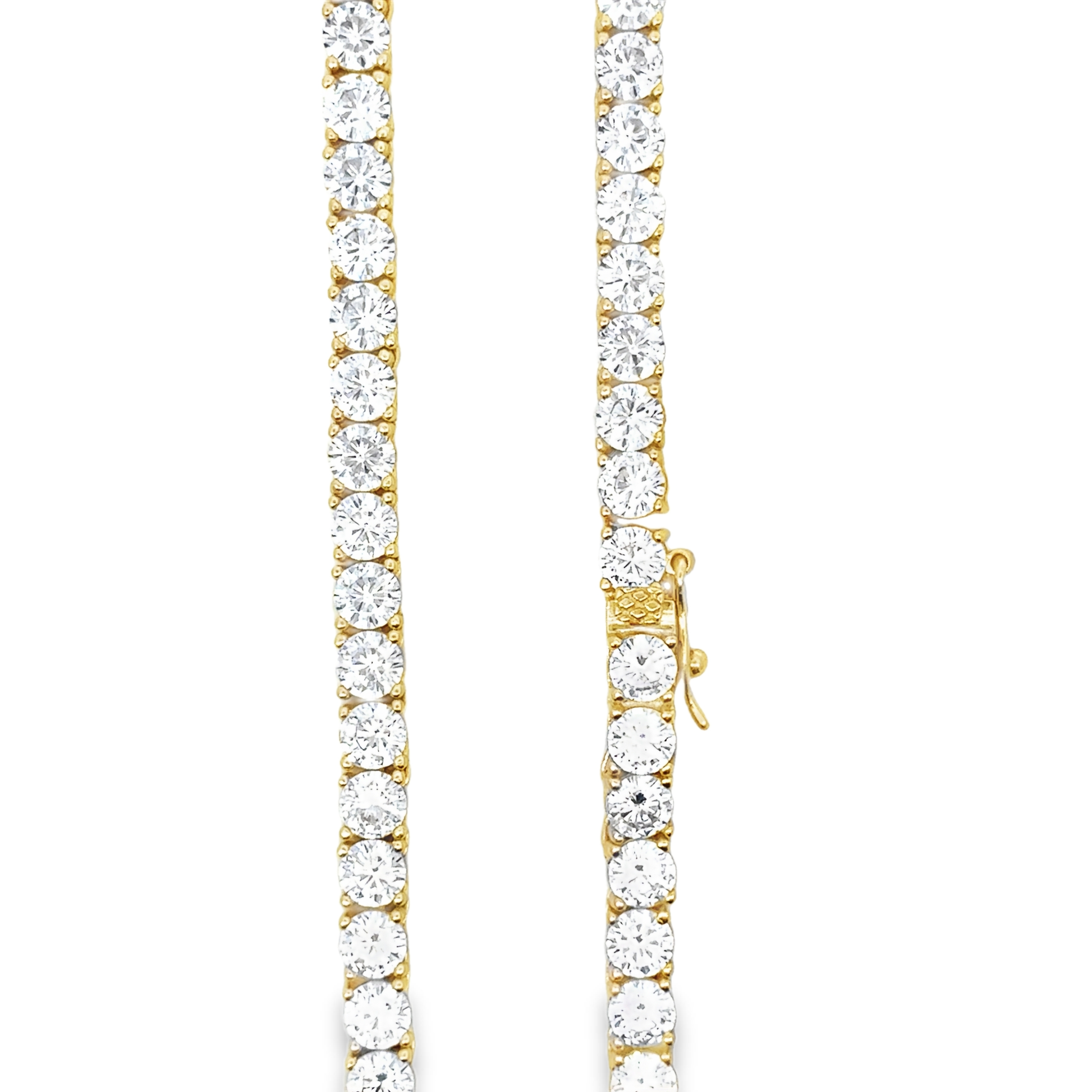 The Icedout Tennis Necklace features striking white stones set in durable gold plated 925 sterling silver, blending expert craftsmanship with a timeless design for a refined, elegant look.